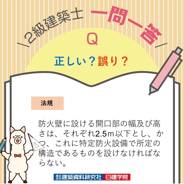 答え:正しい🙆♀️⭕️ 令113条1項四号。防火壁に設ける開口部の幅及び高さ又は防火床に設ける開口部の幅及び長さは、それぞれ2.5m以下とし、かつ、これに所定の特定防火設備を設ける。 x.com/nikkenG/status…